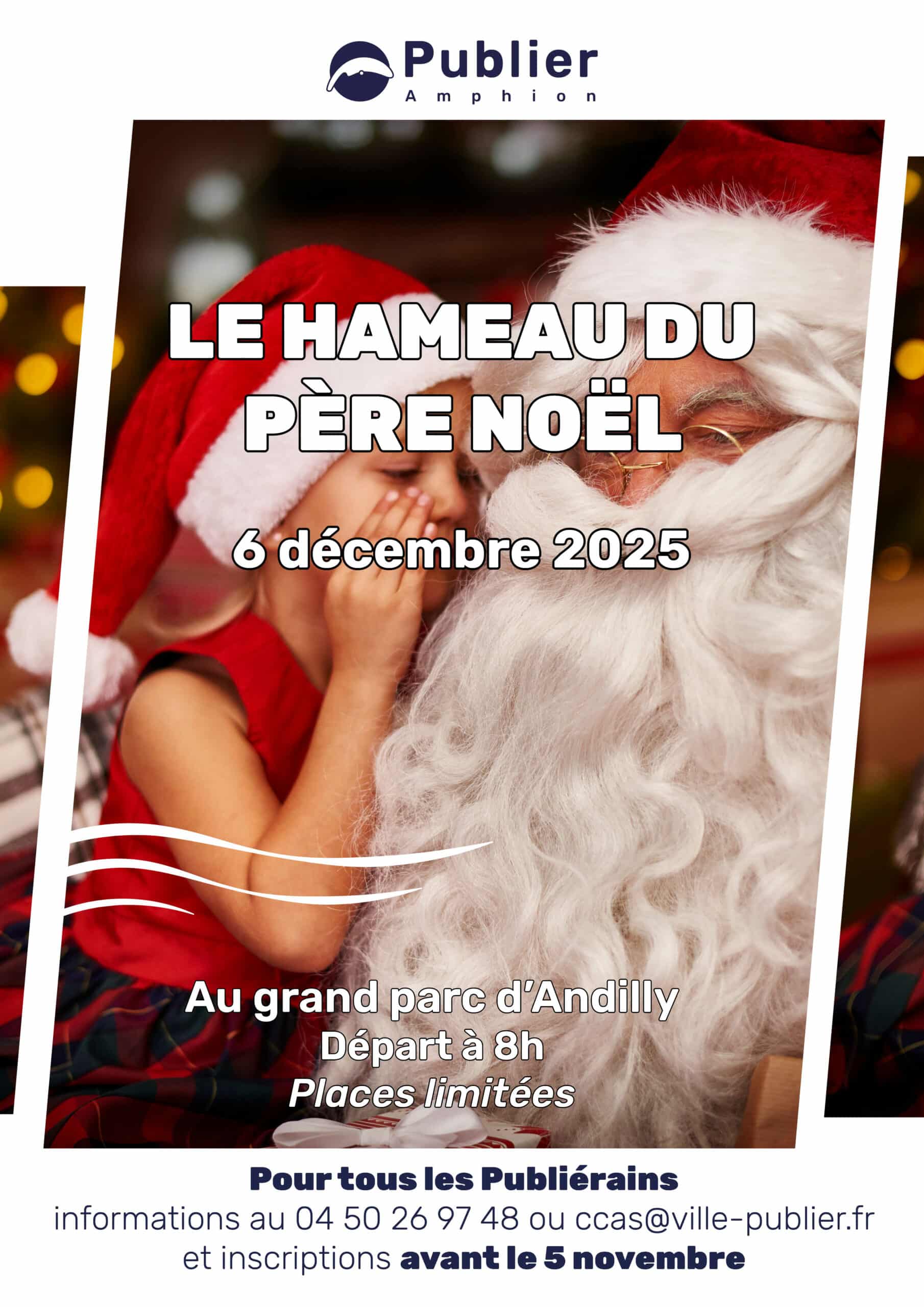 Sortie au hameau du Père Noël Pour les fêtes, le CCAS organise une sortie à Andilly pour découvrir le hameau du Père Noël le samedi 6 décembre.Départ de Publier à 8h.A partir de 10 euros, inscriptions jusqu’au 5 novembre au 04 50 26 97 48 ou à ccas@ville-publier.fr. Nombre de place limité. Voir toutes les actualités →
